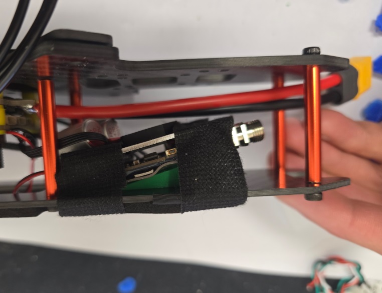 The optic fibre reel is mounted underneath the frame using the 3D-printed reel wedge mount.